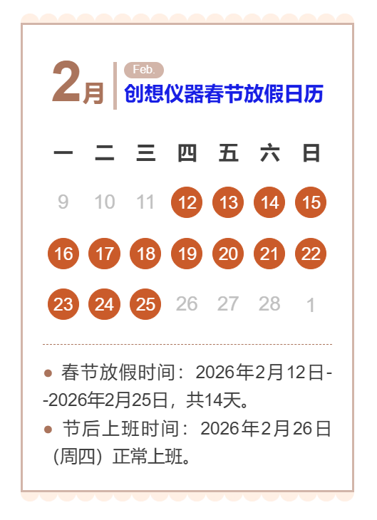2026年無(wú)錫創(chuàng)想儀器有限公司春節(jié)放假通知。